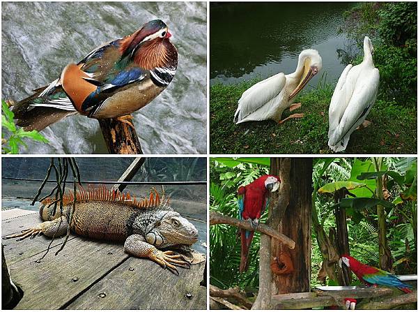 出門時,已早上十點多,還好高速公路上順暢無比. 一到達目的地,才發現停車場早已停滿車輛. 我們依保全人員指示,停在道路兩邊,還要步行約莫200公尺以上,才能到達綠世界的大門口. 剛到時,精神很好,所以不覺得累. 一進門,看到天鵝湖畔有兩隻超大的鵜鶘(光是鵜鶘站著不動,就和我的腰部一般高). 這是第一次看到這麼巨大又溫馴的鳥類,Ashley和Ray還不敢靠近照相呢. 接著,走過金剛鸚鵡區,一隻隻羽毛大又鮮艷的金剛鸚鵡正在注視著觀賞的人潮. 好似它們也在觀賞人類.