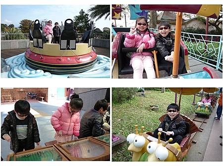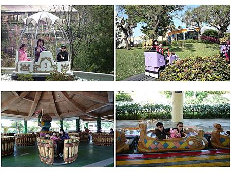 反而是老媽和我坐了轉圈圈式的遊樂設施後,感覺頭很暈. 陪孩子們坐完一輪後,就放心讓Ashley和Ray自己玩個痛快. 早在出發前,就已經上網把Ashley和Ray可以玩的(先確認過身高限制),和敢玩的遊戲項目,標記在地圖上,所以玩起來完全不浪費時間. 像是先去妙妙谷玩飛象藍天,時光旅行,旋轉木馬,小蝸牛,露娜與海盜,人魚木舟,接著到魔法森林玩摩天輪,陽光探戈,和月亮灣玩花園小舟. 11:30AM趕到青春酷片場看魔幻世界(外國劇團)演出. 然後在藍色夏威夷用午餐. 老媽吃牛肉麵套餐, Ashley和Ray分吃一份義大利麵套餐,而我則是點了檸檬雞排之類的套餐. 餐後又去玩了打彈珠和碰碰車. 本來想2:30PM再去看一場節拍屋劇場表演的DREAM CLUB,但老媽怕看劇場時間會拖太久,所以剩餘的時間就讓Ashley和Ray選擇喜愛的遊樂設施重覆地玩,直到3:10PM才依依不捨的離開.