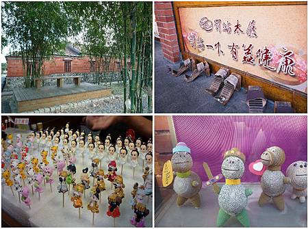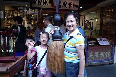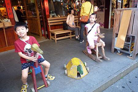 之後往最熱鬧的民藝街坊走去,各個特色店結合傳統的藝術,讓逛街的人,目不暇給. Ashley和Ray也是第一次學著打陀螺,雖然成果不是很理想,但是勇氣可佳. 一路上,Ray吃了剛買的糖蔥(很可惜,錯過了拉糖蔥的表演時段),享受邊吃邊玩的樂趣. 看到師傅現場捏捏麵人,真的好可愛喔! Ray還以為是在捏陶土呢! 趁著婆婆和Ray還在逛店鋪,Ashley和我跑到柑仔店二樓打了一場彈珠,還得到了一根派對笛.