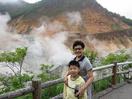 早上第一站是前往昨晚看表演的登別地獄谷http://www.noboribetsu.tv/facil/jigoku.html看"間歇泉". 白天的景致果然和昨天夜裡大不相同. 褐色的山壁不斷地冒煙,冒出陣陣硫磺味,感覺類似北投溫泉,但味道又不一樣,這裡的環境也比較乾淨. 我喜歡這涼涼的天候,就算散散步也快樂. 導遊的腳程頗快,婆婆跟不太上,行路一半就咳嗽不止. 後來,只有Willy和Ashley到達終點,看見間歇泉. 而婆婆,Ray和我則於中途拍拍照,便折返.