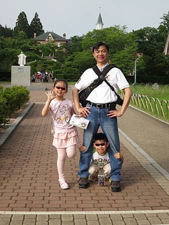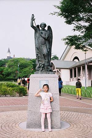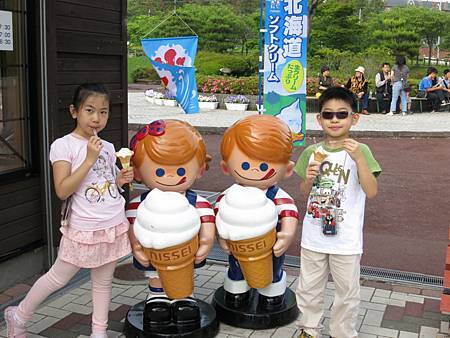 第六站是特拉皮斯修道院(トラピスチヌ修道院) http://homepage2.nifty.com/kazn/trappistine.htm,那是早期一群來自法國的修女來日本傳教時,所創建的第一家女子修道院. 門口小商店-"市民の森"販賣著鮮奶霜淇淋. 它的牛奶味道很濃,至於喜不喜歡這樣的滋味,就因人而異. 反正來北海道,幾乎每個景點都有販賣霜淇淋(只是價格不同). 可是我發現遊客們對於鮮奶霜淇淋的吸引力遠遠勝過於參觀修道院. 我沒有仔細參觀特拉皮斯修道院的原因是因為一下子要帶Ashley和Ray在門口蓋印章,一下子要帶他們排隊上廁所,一下子要買冰淇淋給他們吃... 反正扣掉顧老的,小的,時間也不多了,哪裡有空閒走透透?