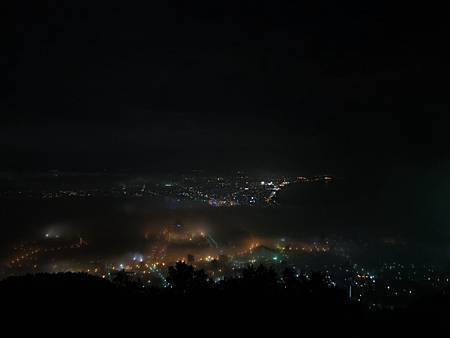 等搭上纜車(纜車很大,一車可以容納約75人)上山,奇蹟出現了! 天氣慢慢開始好轉. 從一開始霧很濃,到漸漸散去. 導遊讓我們破例在山上待比較久的時間. 讓我們見識到函館山的百萬夜景(比我上次招待日本朋友到台北101大樓上觀景,美多了!),只是觀光客很多,超級擁擠. 在此建議走不動的老人家可以待在室內觀景台,因為有椅子坐,一樣可以透過透明玻璃欣賞美麗的夜景.