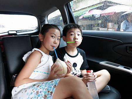 一家人填飽肚子後,走回停車場的途中,又被沿途的攤販給吸引住. Willy買了兩瓶冰的椰子水,Ashley則是買一顆(才10元喔!)椰子. 不料,正當我垂涎那碩大的蓮霧時,突然下起驟雨~ 顧不得買蓮霧了,大伙兒趕緊跑回車上躲雨. Willy問我: "下這麼大的午後陣雨,我們還要到潮州去尋找有名的冷熱冰嗎?" 其實剛剛在豬腳店真的吃撐了,所以便省略了第二站潮州冷熱冰,直接開往墾丁.
