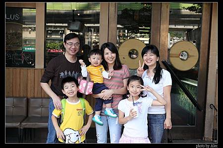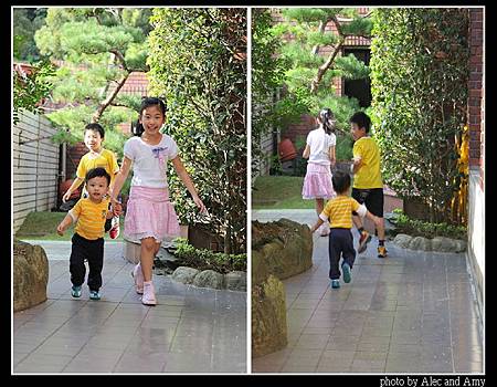 這回,我點了一份"青醬蘑菇雞肉鬼麵",不點bagel了. 雖然義大利麵稍嫌油膩些,但味道還真不錯吃. 配上我點的熱紅茶(附上熱鮮奶喔~)去油解膩一番,感覺很搭(熱紅茶比上次去日光行館點的XXX茶,好喝多了). 大伙兒都點了各種不同的餐點,連小Q寶都有Ginny為他準備的Baby特餐. 小孩子們吃得快,不一會兒就迫不及待地到店門外玩耍. 一方面也因為今天的風很涼爽,加上和煦的陽光,所以讓人捨不得只待在室內.