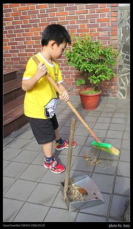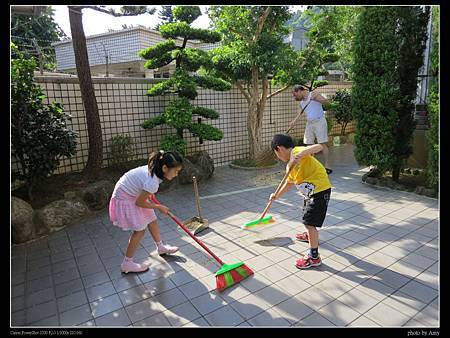用餐畢,我們開車載著可憐的Willy回公司加班,之後再返回娘家. 只見老爸是個閒不住的人,又開始打掃庭院了. 我便慫恿Ashley和Ray去幫阿公掃掃地. 平常在家只有機會使用吸塵器和3M魔布強效拖把. 趁此機會,在阿公阿嬤家學會使用不同種的掃把和畚箕,待回學校,做掃除工作時,才能得心應手.