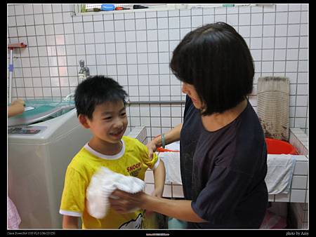 等幫完阿公掃院子,我又叫Ashley和Ray去幫阿嬤洗衣服. 在家中,我洗衣的方式,就是把深色,淺色衣服分開,頂多塗個衣領精在難洗的地方,然後丟進滾筒洗衣機(懶人法). 而老媽堅持洗衣的方式是: 先用南僑肥皂把比較容易藏污納垢的袖口,衣領,在洗衣板上刷過,輕洗,再丟入一般洗衣機中脫水. Ashley和Ray覺得碰水很好玩,倒是還沒幫到什麼忙,就已弄得自己一身濕了.