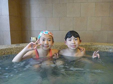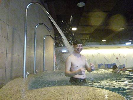終於來到Ashley和Ray期待已久的水療館. 因為要走頗長的一段路才能到水療館,所以我們到了水療館才更衣,並且帶了換洗衣物去. 這回人還蠻多的(比起以前去清新溫泉飯店和煙波大飯店時),幾乎都是family trip才會來這兒玩水(旅行團的遊客在此時都還在外面景點遊玩勒). 雖然人數較多,但我們還是每一樣水療設備都玩到. 而且還好這次幫Ashley和Ray準備了一顆海灘球,讓他們玩了更久.