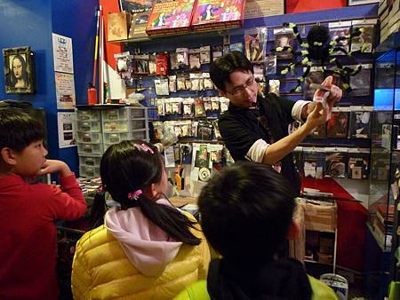 用餐畢,我們回程經過123露天市集,感覺上這裡好像小型夜市,跟購物廣場內的名牌店很不一樣. Ashley和Ray被一家賣魔術道具的店給吸引住,因櫃台前正聚集一群小孩子們看著老闆變魔術. 等Ashley和Ray看夠了魔術表演,我們進Family Mart買牛奶,豆漿,咖啡,接著到B區B1的奧瑪烘培AUMA BAKERY買了麵包回飯店當明日的早餐.