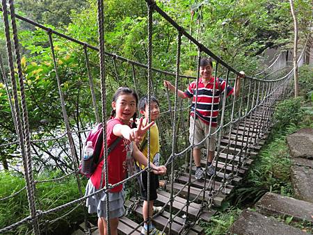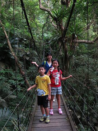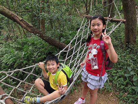 我們走所謂最輕鬆的一環(見官網地圖http://www.dabangan.com.tw/guide/01.php),約30分鐘的行程. 其實走走停停,蓋蓋印章,拍拍照,玩玩吊床,涼亭休息喝水,上個廁所,等他人過橋,餵魚,玩遊戲器材...等等,早就超過30分鐘了. 一路上多是階梯步道,對於有些不適合走階梯的老人和小小孩(不方便推嬰兒車)還是不適宜. 但對於不常運動的Ashley, Ray和我來說很棒,可以小小鍛鍊一下腿力.