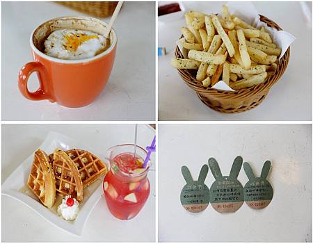 不過會來這兒的人,真的都是來遛小孩的. 我們是下午茶時段去,各點了一些咖啡,果汁,茶類...等等,外加個鬆餅和薯條. 個人覺得餐點不怎麼樣,反正就是觀光區的餐點. 但此環境可以讓媽媽們八卦很久,因為孩子們都在包廂外頭追兔兔,不會來纏媽媽(真感謝小兔兔的魅力~).