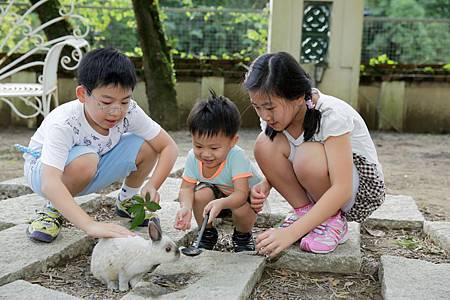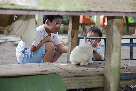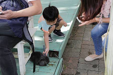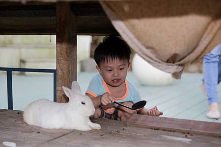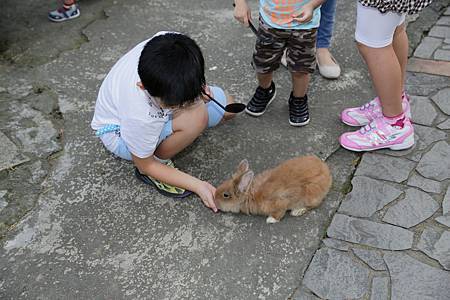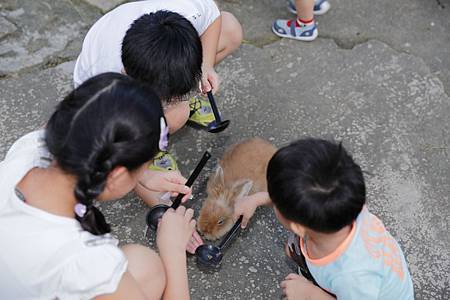 如果怕用手直接餵兔兔的小朋友,店家還免費提供長柄湯池供裝飼料餵食兔子. 只是各位小朋友們,請一定要訓練自己的耐心啊~ 有些兔兔是真的吃飽了,或者還在咀嚼中,所以別一直逼牠吃啊! 牠會嚇跑,躲起來喔!