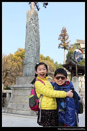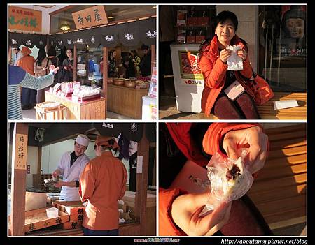 到了天滿宮門口,導遊極力推大家吃吃看當地美食『梅枝餅』. 於是我們買來嚐嚐,就像是麻糬裡面包著紅豆餡,把麻糬用鐵板烤酥,表皮烙印著梅花圖案. 可是,不知為什麼,即便趁熱吃,也沒有吃到外酥內軟的口感? 只是比較不甜,個人並不覺得特別好吃就是了.