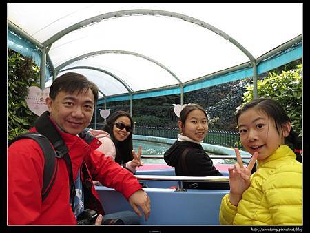 然後,搭乘單軌的(5)空中小飛船. Iris,Ray,Ashley和我搭一台,其餘的人搭乘另一台. 這是靠遊客自己操作,途中會看到一台拍照的機器. 可惜機器有點兒慢半拍,像Iris和我都已轉頭看前方,才聽到喀擦一聲. 後來發現婆婆,大姑,Minnie和Willy更慘,拍出來的照片沒有一人看鏡頭. 我們這台至少還有Ashley和Ray看鏡頭.