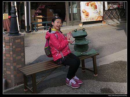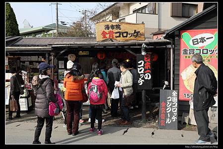 往停車場的反方向走,我們去尋找導遊介紹的排隊美食-可樂餅(其實早餐還沒消化完ㄟ). 原來,Iris和Minnie早就在這兒了! 這兩個小孩,腳程還真快,不眷戀湖泊. 倒想多留些時間,好好逛逛湯布院的特色商店.