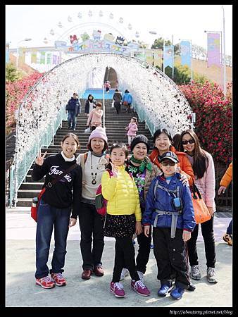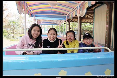 再來(9)Hello Kitty的天使小捷運,由Iris, Minnie, Ashley和Willy去搭乘,換我幫他們拍照. 這玩意兒小小的,但速度很快,不一會兒就繞個兩三圈.