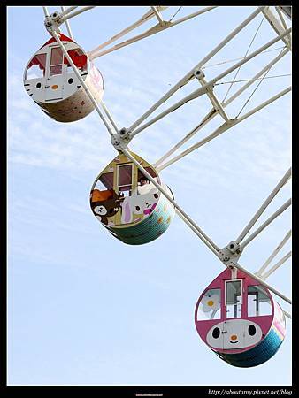 最後只有我陪Ray搭乘(10)摩天輪,因為大家想要往回走去看遊行. 而我們從高空中往下看,看到好多的乳牛喔~ 也看到阿嬤走累了,在半路坐下來休息,請大家吃販賣機中的冰淇淋.