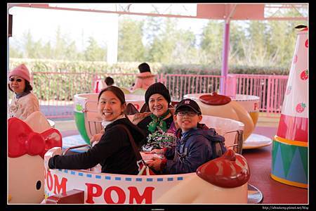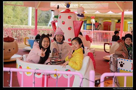 另一區,就要爬很多樓梯. 沒想到,婆婆還是跟著我們一起爬上去了(為她鼓掌!). 最先看到的是(7)草莓轉轉車,就是咖啡杯啦~ 只是圖案全是三麗鷗明星. 我和Willy不想玩會暈的遊具,在旁邊幫他們拍照. 但Ashley和Ray玩到後來也變臉(受不了暈眩)了,還好下來後沒有暈吐.