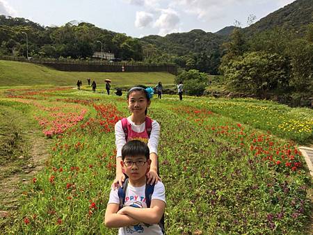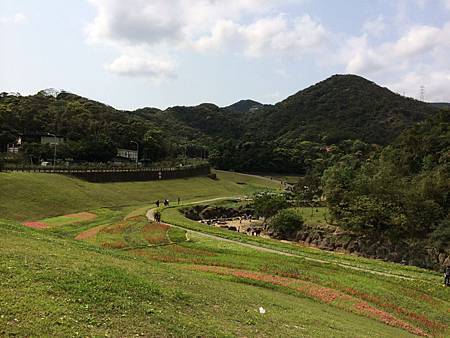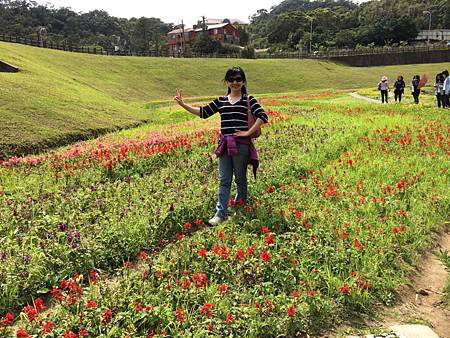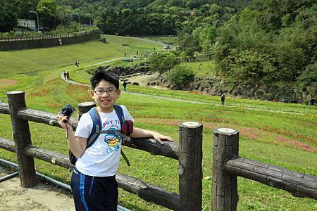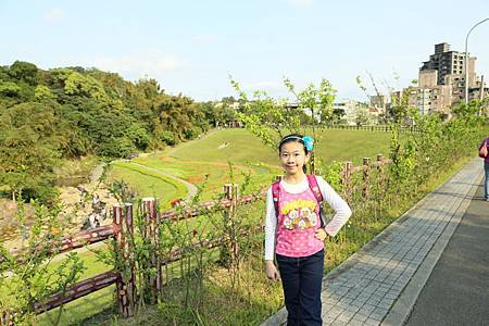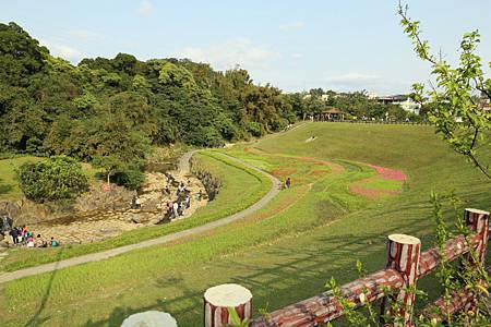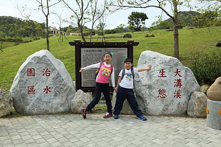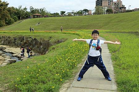 一見到大溝溪生態治水園區http://news.ltn.com.tw/news/local/paper/739219石碑,我就放心來對地方了. 剛才Ashley和Ray還一路抱怨著,到底到了沒? 是不是迷路了? 現在可就開心了. 一開始進入眼簾的是石階和綠地,接著一直往內走,才會有哇、哇、哇的感覺. 想不到大溝溪生態治水園區腹地這麼大又廣,除了花海,還有小溪,還有一大片的大草坪. 住在這附近的住戶,真是幸福啊~