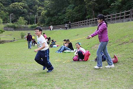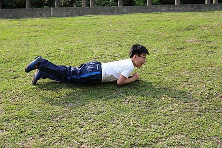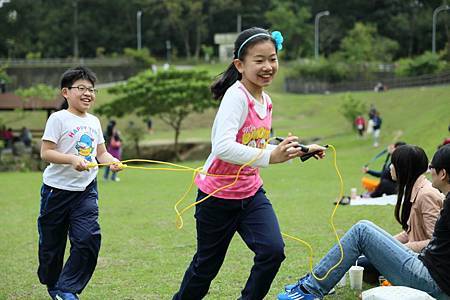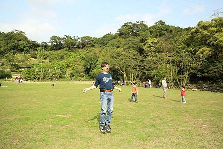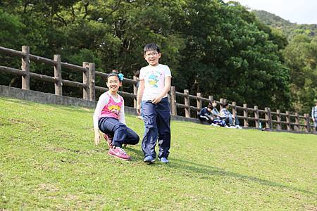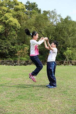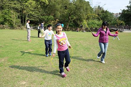 往另一個方向走去,有橋連通一片大草地. 我們不想和其他人一起擠在涼亭裡歇息. 反觀這片美好的草坪,不來翻滾一下,怕對不起自己. Ashley比較怕弄髒衣服,放不開翻滾草地. Ray亂滾一通,不過直說好痛,因為翻滾中有壓到小石頭. 接下來,Ashley和Ray已忍不住,掏起自備的跳繩,開心地玩了起來.