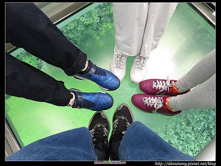 Finally,終於搭上了水晶纜車! 腳下的透明玻璃,因太多人踩踏過,而顯得模糊不清,所以沒有想像中恐怖. 反倒是咻咻地風聲,還有車廂進站時的搖晃感,讓我感到害怕! 中途有兩三站,車門會自動打開,再由服務人員幫你關閉(但沒看到有人中途上下纜車).