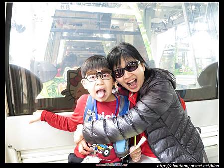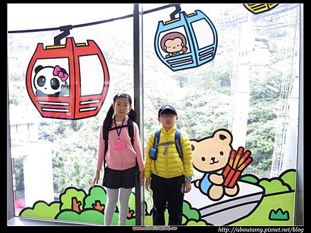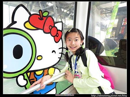 回程,沒有預約水晶車箱,跟著大家一起排隊搭乘普通車箱. 結果排了將近20~30分鐘的隊伍,雙腿快累斃了! 普通車箱最高乘載8人,所以回程和其他人共乘一個車箱. 本想叫Ashley和Ray和車箱內的貓熊和Hello Kitty貼圖合照,但在外人面前,Ashley和Ray總是顯得特別緬腆,不敢輕舉妄動. 想要獨享一個車箱的朋友們,建議選擇水晶車箱,因它最多只能乘載5個人. 所以來時只有我們一家人獨享一個車箱時,Ray比較能釋放本性~放心地驚聲尖叫.