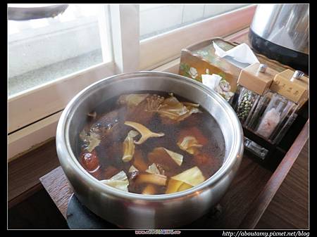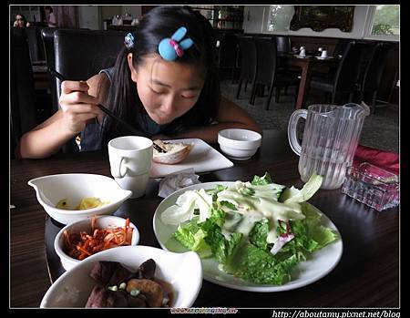 進去後,一樓沒有一個客人. 老媽還一度懷疑是不是我記錯店家的名字? 不是應該用餐時間會高朋滿座嗎? 服務人員帶我們上了二樓,也只有一桌的客人. 不管了,先點餐給因飢餓而吵鬧的Ray再說. 點餐的方式是只能選擇主餐,每一份餐點都是以套餐形式上桌. 餐點分量很充足,小菜吃完還可以再續. 但有一種好像中式餐點(養生湯),又好像西式餐點(生菜沙拉和麵包)混淆的錯覺.