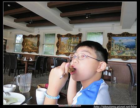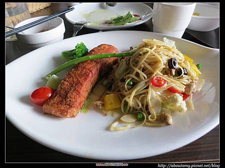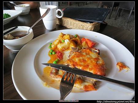 老媽和我都點了泰式椒麻香料雞腿排,Ashley點了地中海香料酥烤鮭魚和義大利蒜香鯷魚野菇時蔬細扁麵雙拼,我幫Ray點了荷蘭Edam起司香焗豬排當主餐. 沒想到,最餓的Ray等了好久,主餐才上桌. 老實說,午餐花掉蠻多的時間. 但悠哉地享受這一頓甚麼都有的豐盛餐點,也算是種另類的放鬆吧! 用餐期間,下了一陣雨. 用完餐之後,雨也停了(真是老天保佑!).