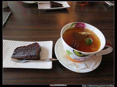 甜點 巧克力蛋糕和熱的金桔梅茶