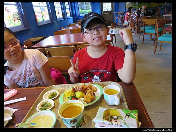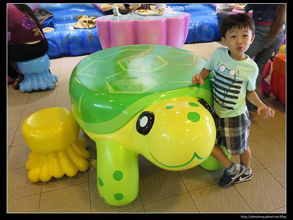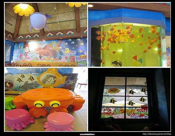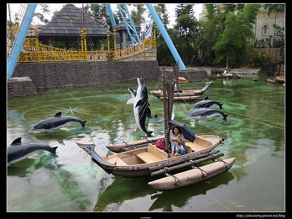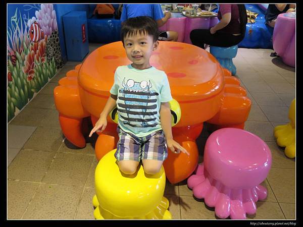 玩完之後,午餐時間也到了. 大家配合Ashley的心願,來到『南太平洋』的『海底餐廳』. 裡頭盡是可愛的佈置,連桌椅都是.雖說餐點不怎麼樣,但吃完兒童餐,整套餐具還送給你喔! 用餐畢,雨越下越大的趨勢. Alec先陪小Q玩完『巨嘴鳥』(類似小飛象),接著大家要一起玩『獨木舟』. 可是Ashley和Ray怕淋雨,只有Ginny陪著天不怕,地不怕的小Q繼續玩『獨木舟』和『搖滾蒸氣船』.
