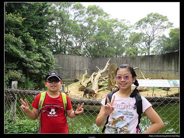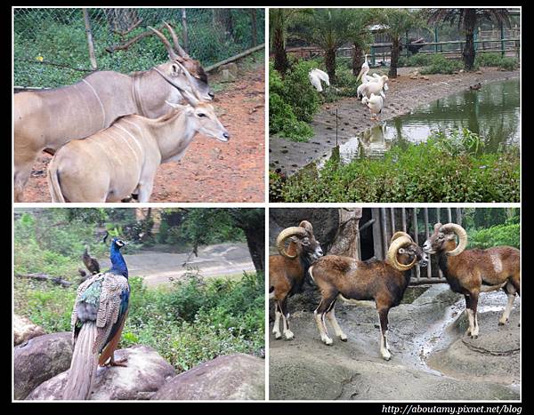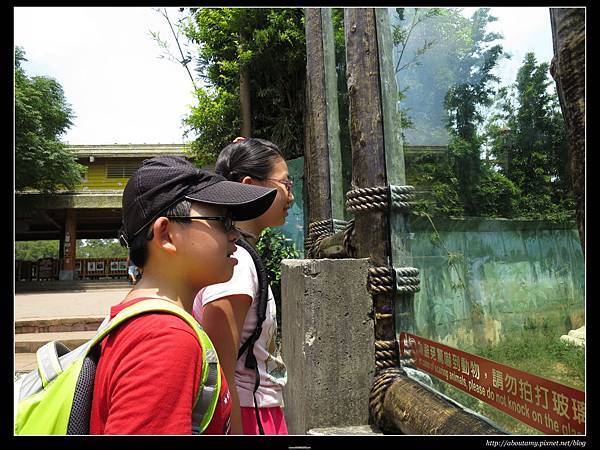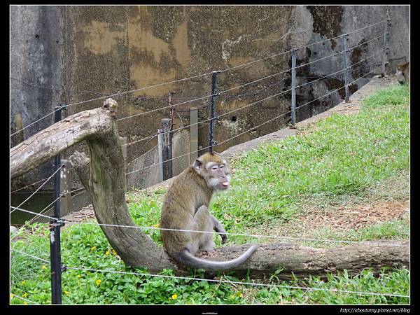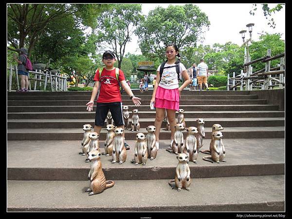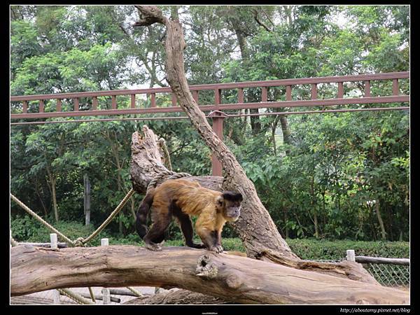 進了『非洲部落』隨意拍拍白老虎和狐獴,等待Alec, Ginny和小Q搭完『蒸氣火車』歸來,再一起去搭乘『猛獸區遊園巴士』. 『猛獸區遊園巴士』就是一般公車,非常慢速前進,讓小孩們近距離欣賞猛獸. 只不過猛獸們熱到懶洋洋,一點兒都提不起勁兒. 倒是猴群搶食的景觀令小朋友們目瞪口呆. 接著我們又去搭乘『猴子行大運』,就是空中腳踏車啦~ 剛好在多種類的猴子區中,還有照相機自動幫你拍照喔!