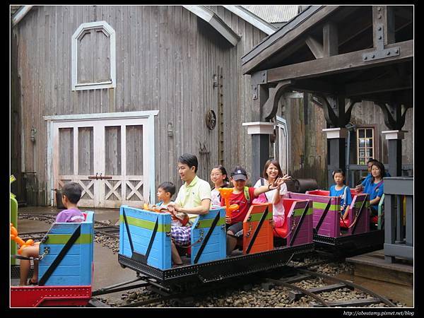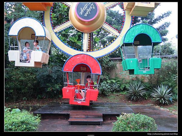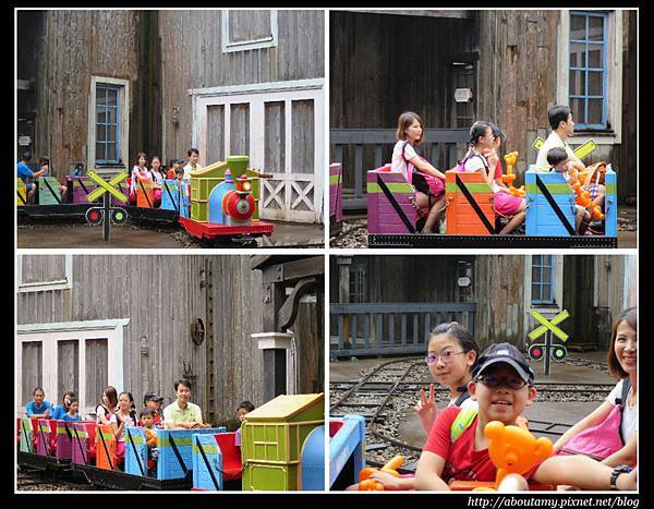 之後,天空還是下著雨. 大家還是繼續玩了『採礦車』和『摩天篷車』(迷你摩天輪). 接下來,Alec、Ginny帶小Q到『邊城劇場』看哈比哈妮唱唱跳跳,跳得好開心! 可是Ashley和Ray覺得無趣,只好帶他們逛逛禮品店,去『電子益智廣場』玩玩桌上HOCKEY,騎電動摩拓車打發時間. 之後,Alec、Ginny帶小Q決定先行離開,去關西買青草茶. 而我則帶著Ashley和Ray繼續玩之前沒玩到的『蒸氣火車』.