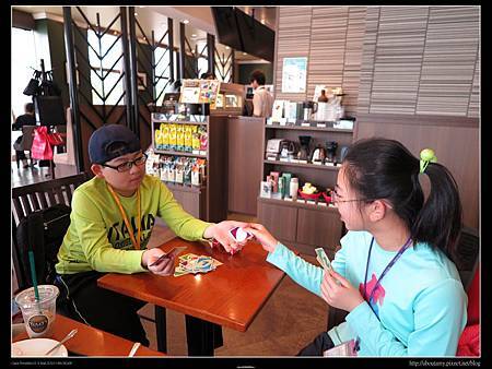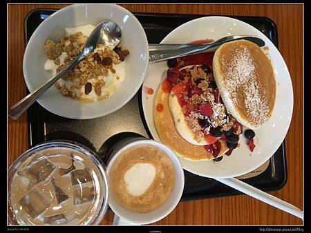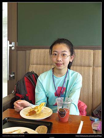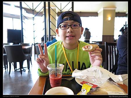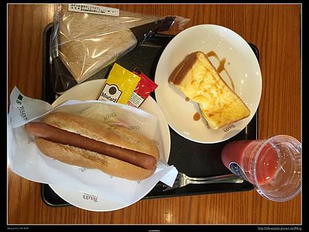 走進去瞧一瞧,發現窗明几淨又沒有菸味. 雖然它的玻璃上也印有標明分菸制,只是當下我一進去並沒聞到菸味. 於是我們四人各自點了不同的餐點,有熱狗麵包,三明治,優格,鬆餅,吐司,果汁,咖啡. 每個人都吃得心滿意足了才離開.