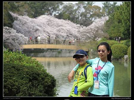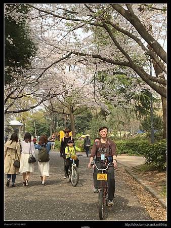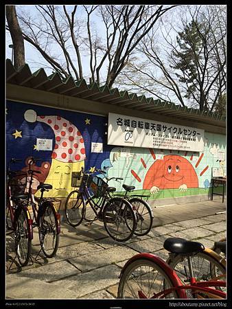 越往裡面走去,才發現整個名城公園佔地面積好大喔~(網路上資料記載名城公園是以名古屋城為中心,二之丸、三之丸、一直到北園的幾個公園的總稱.)裡面有風車,有櫻花,有河,有池塘,有自行車道…等等. Ashley和Ray想要和日本人一樣在公園內騎自行車,我卻一時找不到自行車出租店. 帶著大家整整找繞了一大片公園(可是也因此拍到好多美景呦~),走到大家都已腳酸,正準備放棄找尋時…,我們才發現一進名城公園的右手邊(自行車道不遠處),即是名城(めいじょう)自転車天国出租處. 這下子Ray最開心了!