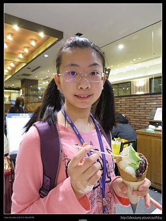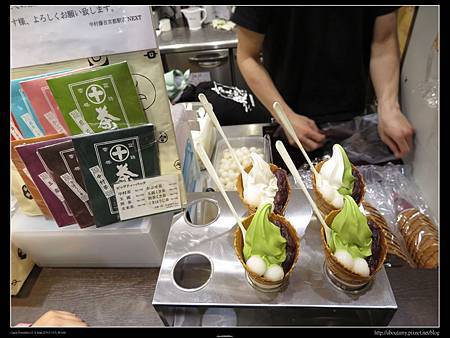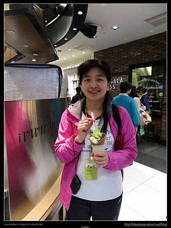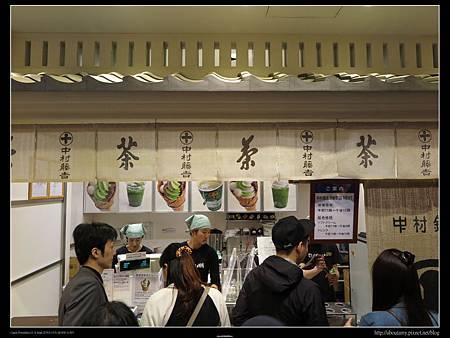 然而,不管下不下雨,似乎也澆熄不了我那想吃中村藤吉http://www.tokichi.jp/chinese_traditional/stores/index.html抹茶麻糬紅豆霜淇淋的慾望,於是我們走回京都駅. 找來找去,終於找到不顯眼的京都站店NEXT (營業時間11:00~21:00),而且還有很多人排隊呢! 這回Willy沒有阻止我排隊,因為外頭正下著雨呢! 撐傘賞櫻多麼無趣啊~ 只是排到了我們,卻還是沒有空位子坐,只好站著吃抹茶麻糬紅豆霜淇淋. 之後走到伊勢丹百貨公司http://kyoto.wjr-isetan.co.jp.t.do.hp.transer.com/的地下超市買些水果,拿回飯店的冰箱放(Ashley說如果現在不買,等賞夜櫻回來,日本賣水果的店就都關門了). 一邊討論下一站去哪裡好.