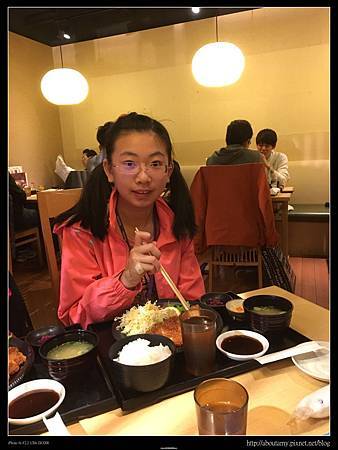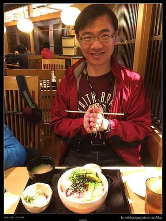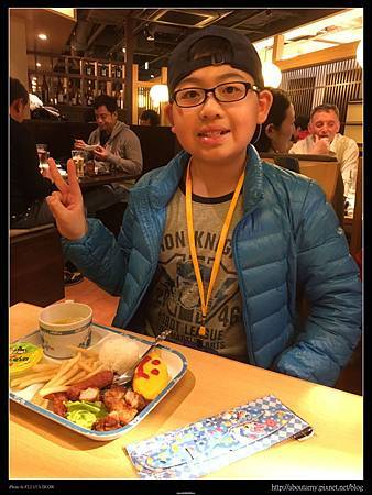 喜歡蓋印章留念的人,也可以拿門票來蓋喔! 等Willy拍夠了東寺夜櫻,雨又開始下了~. 我們仍舊搭計程車回京都駅,只是司機先生不知Ibis Styles Kyoto Station Hotel在那兒,把我們載到京都駅前站(計程車費770日元),於是我們就在Kyoto-Yodoboshi http://www.yodobashi-kyoto.com/index.html的6F吃晚餐. 我們選了名物もも焼き 大山(だいせん)http://www.yodobashi-kyoto.com/restaurant/restaurant_dais.html,因為平價,而且可以免費續湯或白飯. Willy這餐終於可以吃到生魚片(帶著不吃生食的妻小出門真委屈~). Ashley和我點了雞排定食,蠻好吃的. Ray點兒童餐(因為可以自己選玩具).
