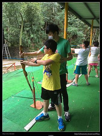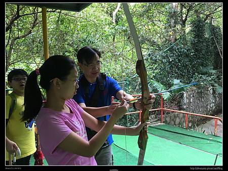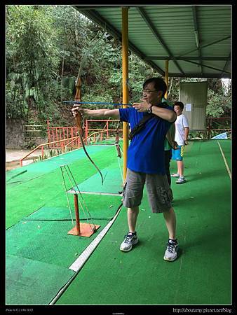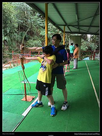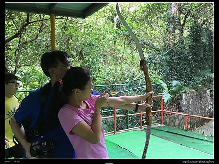 所以我們請櫃檯派車來搬行李,到主館櫃檯辦理好check out之後,便往【射箭場】的方向走去(需要爬點兒小坡就是了). 抵達時,還要爬樓梯上去【射箭場】(對老人家或娃娃車就不是很方便). 因為Ashley和Ray以前在九族文化村和花蓮理想大地都有玩過射箭,所以這次很快地就捉回熟悉感. 這裡的規矩是等玩家都射玩了一輪,再集體下去拔箭回來. 換第二位排在你後面的人玩. 我們去玩時,後面並沒有人排隊. 所以只有Ashley和Ray輪流玩一個靶. 只是射久了手臂會痠,手指也會痛.