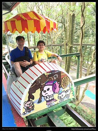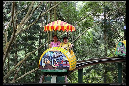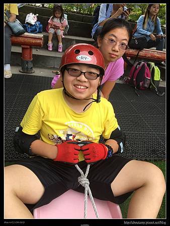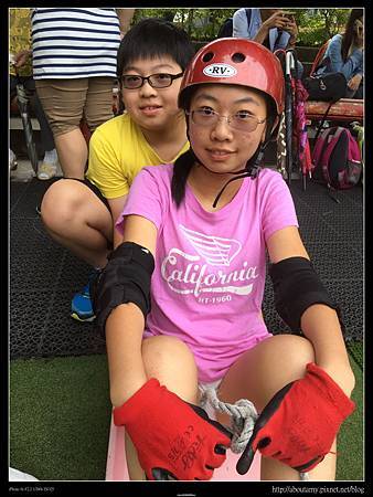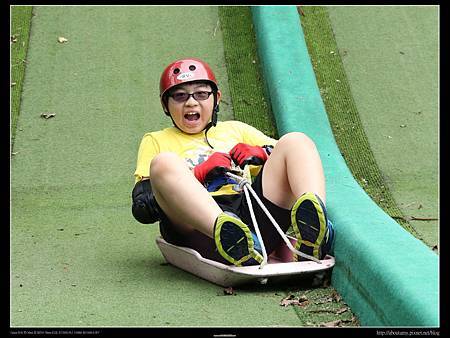 本來Ray說不想滑,但是看到Ashley滑起來速度並沒有想像中快,所以也和姊姊一起排隊玩起來. 我告訴Ashley和Ray要把握機會趕快滑,因為這裡的規定是只有6~12歲才能玩的喲~. 【滑草場體驗區】的滑草坡沒有草,是地毯. 而且滑板下沒有裝輪子,所以速度不會很快. 就算滑歪了翻車,頂多只是昨天下過雨的小積水濺起,算是安全的.