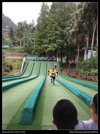 之後回到【滑草場體驗區】,當時已經是一票人馬在排隊. 這裡的大小朋友雖然多,但是大家都很守規矩,一個一個來,不推擠. 也都自己戴好護具和安全帽再滑;滑玩後,自己把滑板拖上來(護具、安全帽及滑板由飯店提供)換下一位玩. 因為只有一位工作人員(和之前射箭場是同一位),他一個人要顧五條滑道,也難以分身啊!