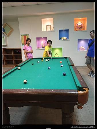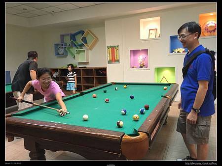 此時天空飄起細雨,人群散去,所以Ashley和Ray得以多玩幾趟. 直到11:30AM,我們又回主館二樓打撞球. 因為只分配到兩支球桿,索性就讓Ashley和Ray自己玩. 只是有時Willy實在看不下去,會下場示範一下(因為Ashley和Ray老是把白球打到地板上來).
