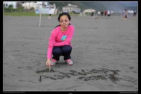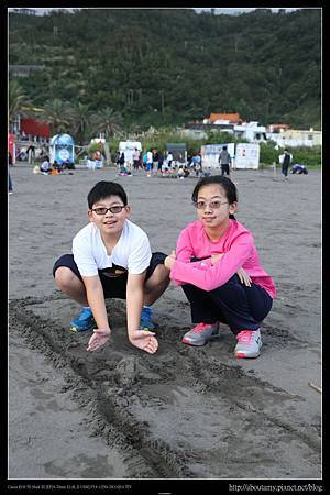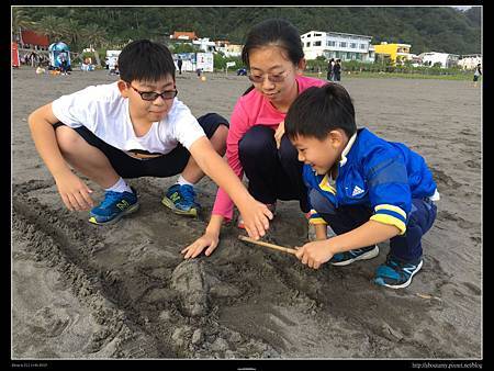 塞車時,孩子們都小睡了一下午覺,所以一下車看見廣闊的沙灘,便黏住了. 就是這邊挖挖做城堡,那邊挖挖做海龜... 反正沒工具也無所謂,沙灘上隨手撿到的樹枝啦、石頭啦、都可以派上用場(還有人把放炮留下的垃圾埋在沙裡…真是超沒公德心).