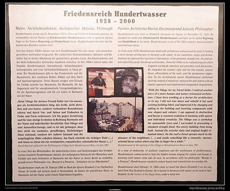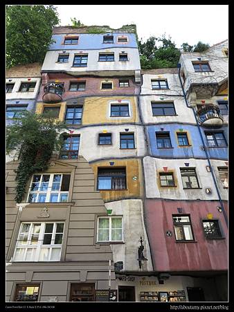 這是由藝術家百水先生 (Friedensreich Hundertwasser)設計,建築師彼得·貝林根 (Peter Pelikan)共同完成的奧地利公共住宅。它的特色在於建築物本身沒有刻意造作的直線,而採用不受限制的形狀與明亮顏色。如果你仔細觀察「百水公寓」的每間公寓,會發現有不規則狀的植物攀爬其中或者突出,那是因為百水先生的設計理念認為人類應該與大自然共生共存。