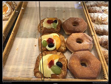 我們沒有走遠,在此處拍拍照、逛逛對面的麵包店、以及「百水村」Hunderwasser Village。Hunderwasser Village裏頭有許多的特色店家,裡面的室內設計也是和Hunderwasserhaus類似,絕大多數都是販賣給觀光客的紀念品或伴手禮。逛累了,我們隨興地坐在噴水池前吃吃看這裡的水果麵包有沒有比台灣的麵包好吃? Ashley和Ray說:「還不錯吃,只是比台灣的價格貴很多。」